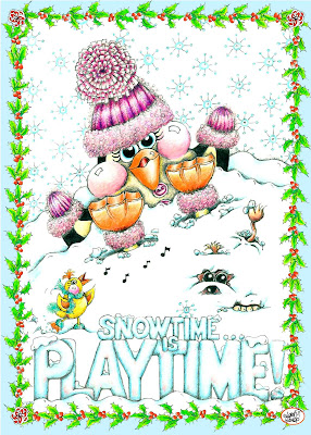 I struggled for days with the sentiment writing on the front and inside. I wanted to play around with the vintage look of the drawing and then add something funny inside. I thought the surprise inside would be fun and maybe unexpected. I only had a little space to put the type, so the wording had to be short and to the point. No fooling around. I had to say what I wanted to in as few short words as I could but I came to a stand still. I couldn't move in any direction. I was stuck. What to do? Days were going by and no closer to a idea. Would I get the cards done on time? I was so getting anxious and worried. How could it be? Everything was going so great. UGGHHH!!! My mind hit a blank. An emptiness. Nothing. Nada. I thought I was surely out of ideas. Who was I kidding? I was creatively 'toast'. But then... just when I thought my card design was to be scraped and never see the light of day, the idea flowed out from my pen. This process took a couple of incubating days and when I just let my mind 'relax', the idea came to me. I was saved. I was rescued from the creative wall that was staring me down while being so relentless. I took a breath and knew that I narrowly escaped the doom of an idea that was a 'flop'. a 'failure', a 'trash can' wonder. The tide turned and out of the 'fog' and 'storm' was an idea that I was proud of and something I felt was exactly how I imagined it and wanted it to be. "Christmas, I thought, is here!"